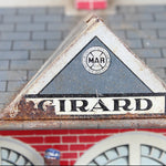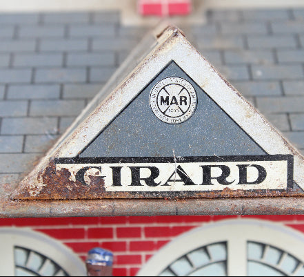 This vintage Marx Girard tin train station measures 9" in length, 5-1/4" in depth and 5-3/4" in height.