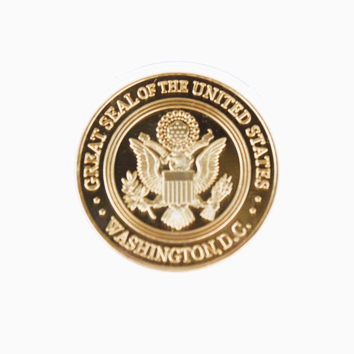 This mint condition 24K gold-plated coin measures 1 ¾” inch in diameter and features the CIA logo on the side painted blue and the Great Seal of the United States on the bright gold side.