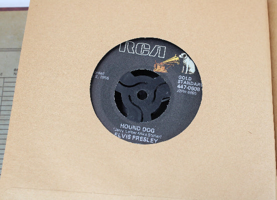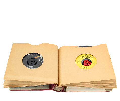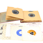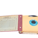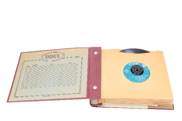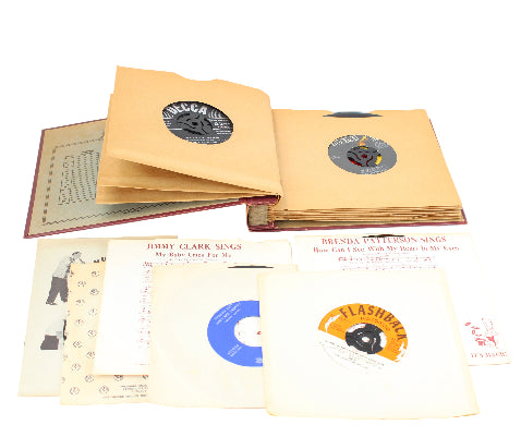 The record book includes 45 rpm records that include Jimmy Clark's "My Baby Cries For Me", "The Chipmunk Song", "Nevertheless", and "Lazy River" by the Mills Bros., "Don't Be Cruel" by Elvis, and "Moonlight Serenade" by Glen Miller.