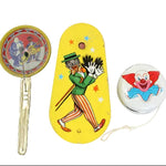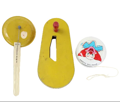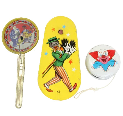 This lot also includes a 6" long jazz theme clacker paddle noise maker, a 5- 1/2" tall handheld noisemaker winder with vaudeville theme and a 1960's Bozo the Clown Yo-Yo.