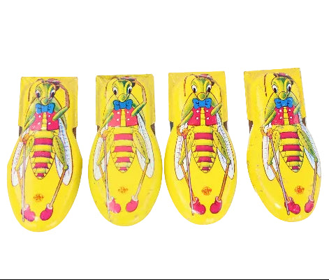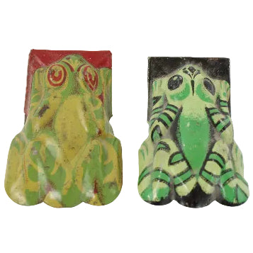 This lot includes: 20 tin-litho handheld clickers that include 3 - 5" Alligators/Crocodiles; 2 - 3" frogs; 4 - 4-1/8" grasshoppers; 1 - 4 1/8" clown; 1 - 1-3/4" 1930's Gridley Milk clicker; 1 - 1-3/8" Weather Bird Shoes clicker (poor condition); 1 - 1-3/4" Red Goose Shoes clicker; 1 - 4" duck; 1 - 3" fiddle playing tiger; 2 - 3" clowns. 2 - 3" fire department badge clickers and 1- 2-1/2" police department badge clicker.