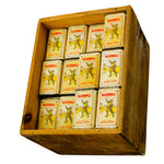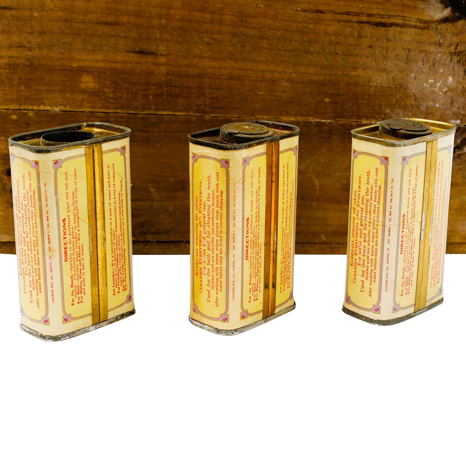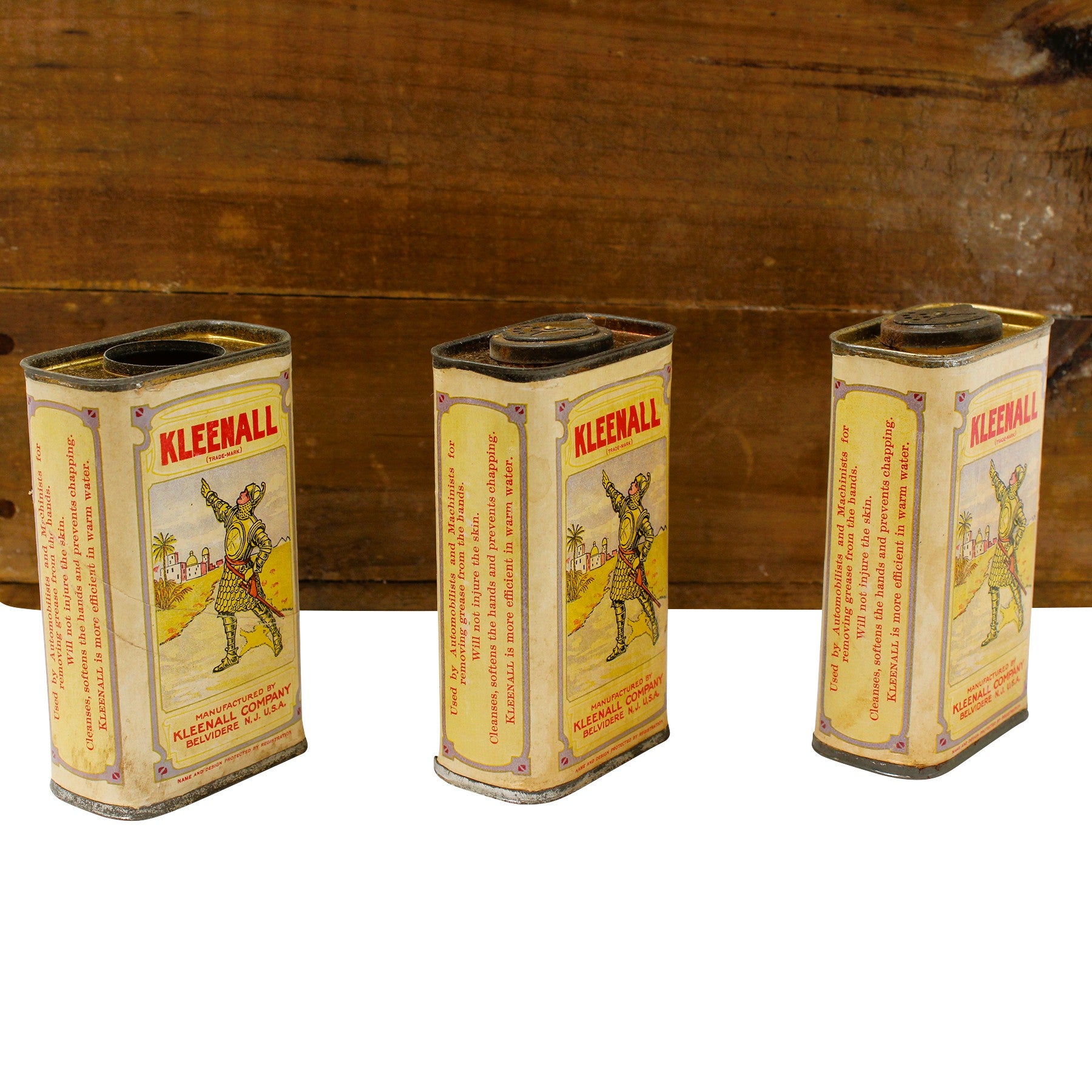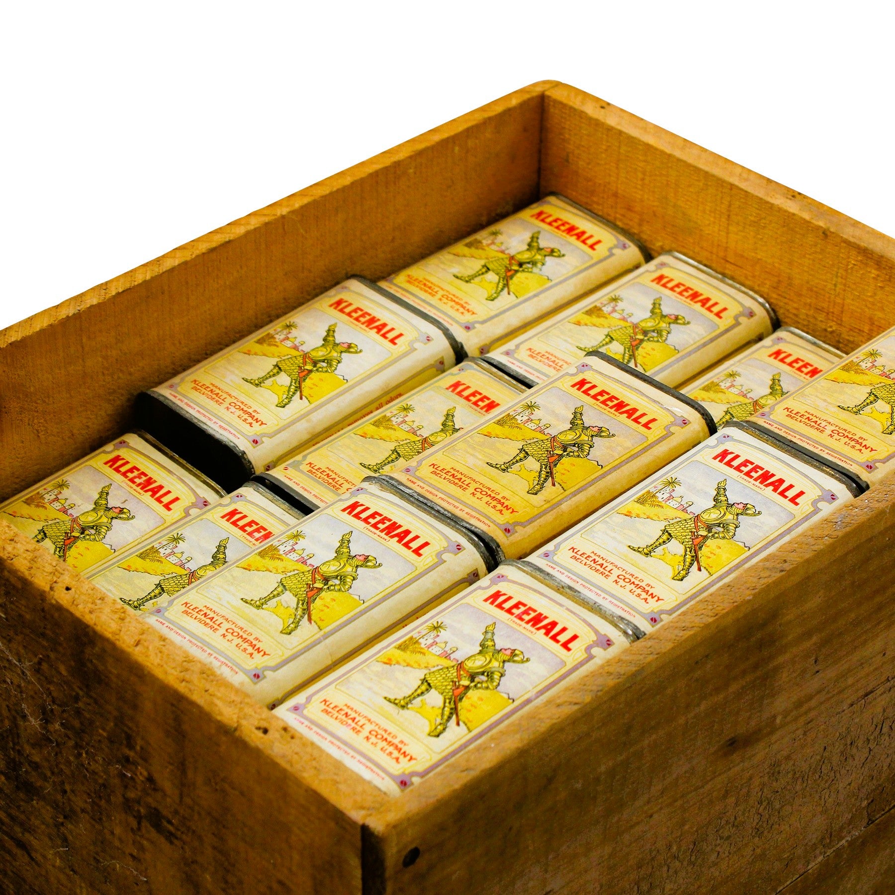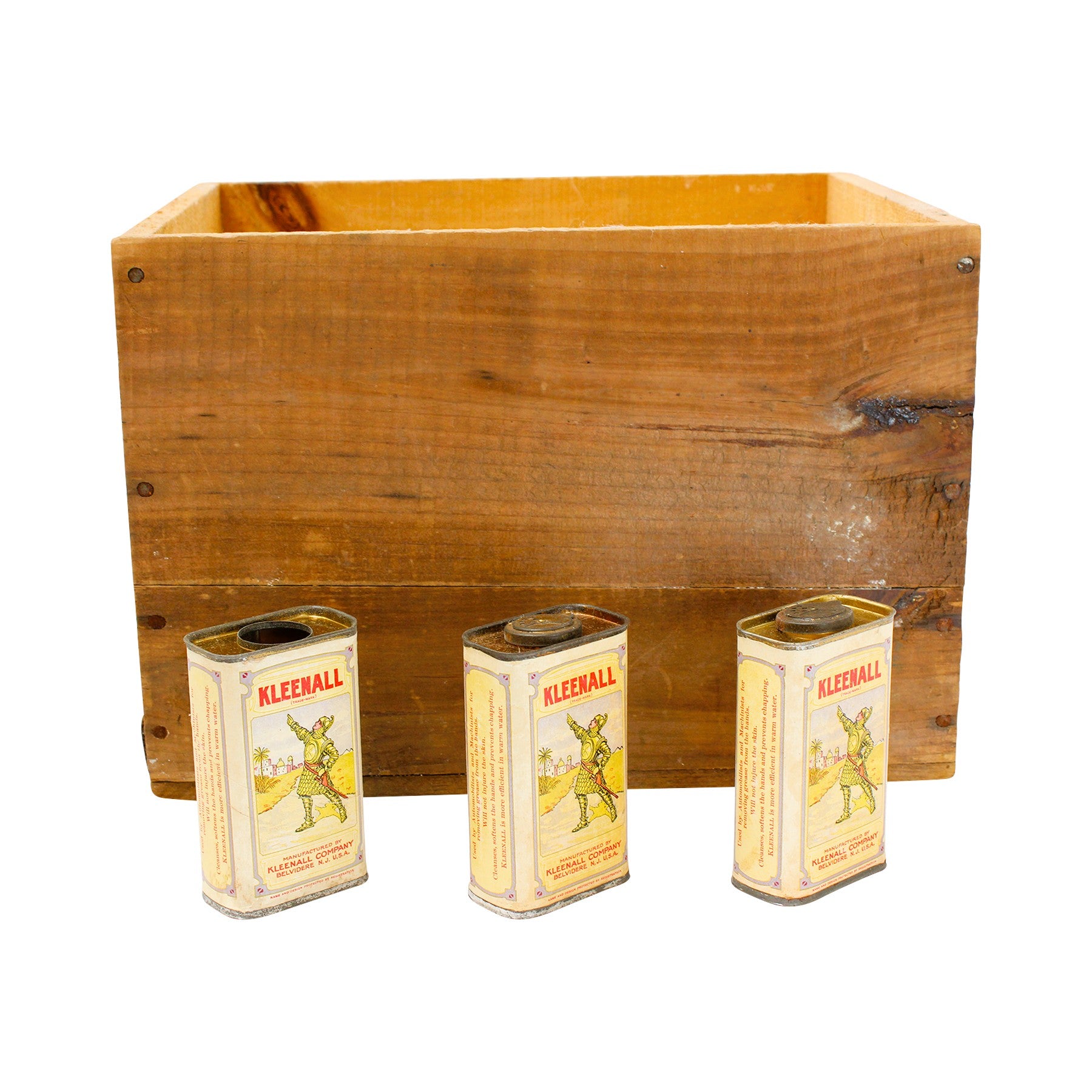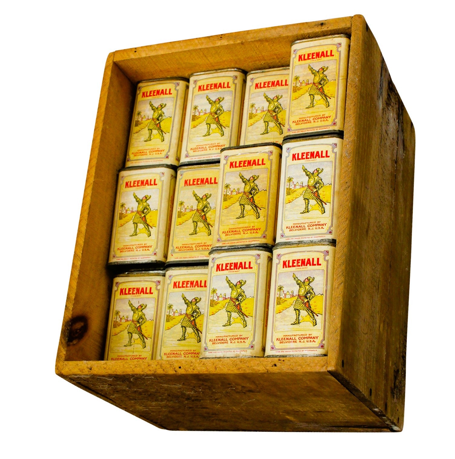 Original Early 1910's Crate Of Over 75 Kleenall Empty Cleaning Powder Tins With Knight Graphics