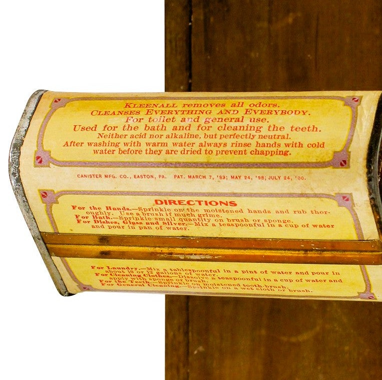 Kleenall was a product that was popular between 1910-1920. The powdered cleaner claimed to clean teeth, toilets, hands, body, dishes, glass, silver and laundry.