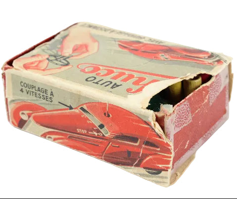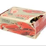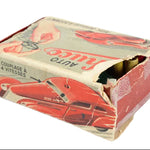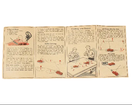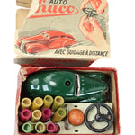 The original instructions are included in the box, along with guidance on operating the wire steering and selecting the proper gear on the four-speed key-wound car. The original Schuco key, steering wheel, extra wires, plastic ball and eleven wood pylons (missing one) are included.