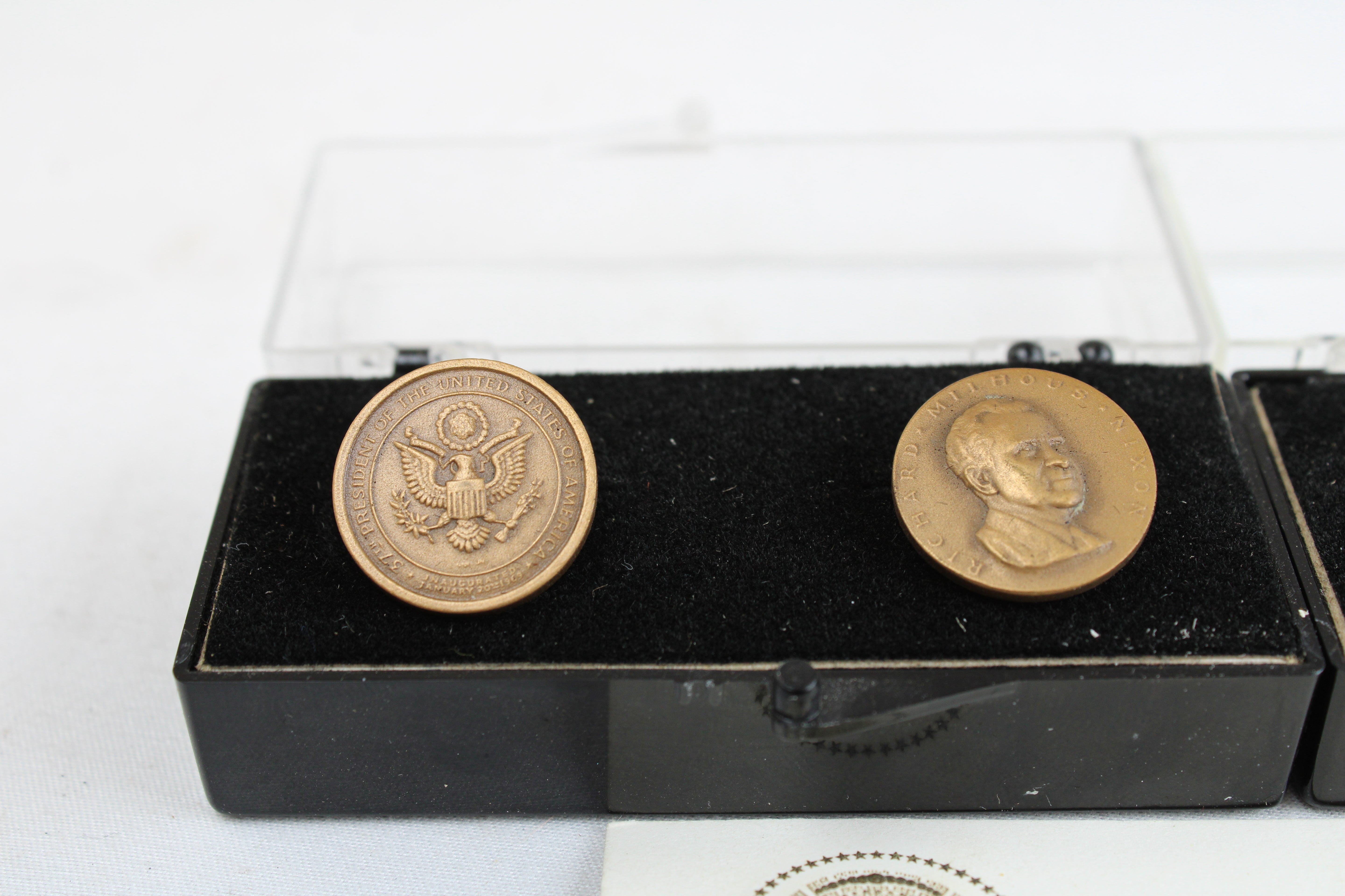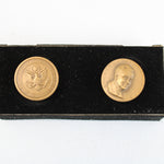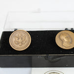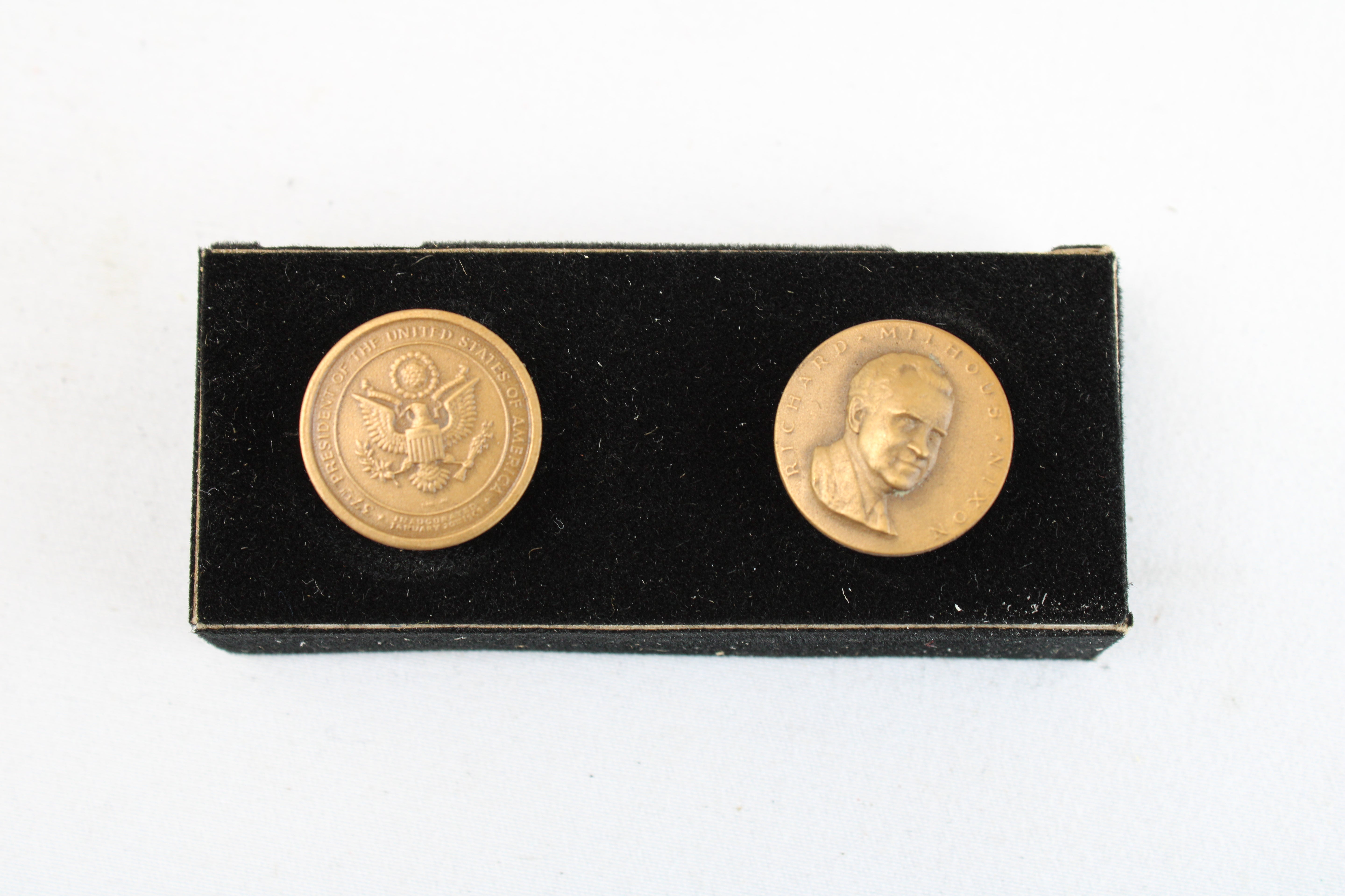 The copper-colored cuff links have an embossed face picture of President Nixon surrounded by his name, Richard Milhous Nixon and the other matching cuff link has the Presidential Seal.
