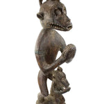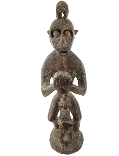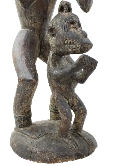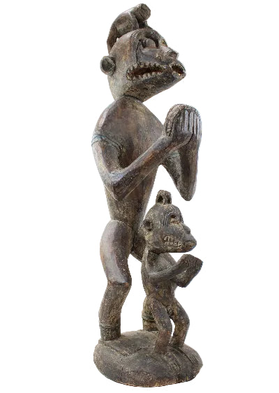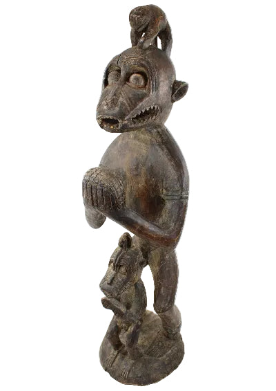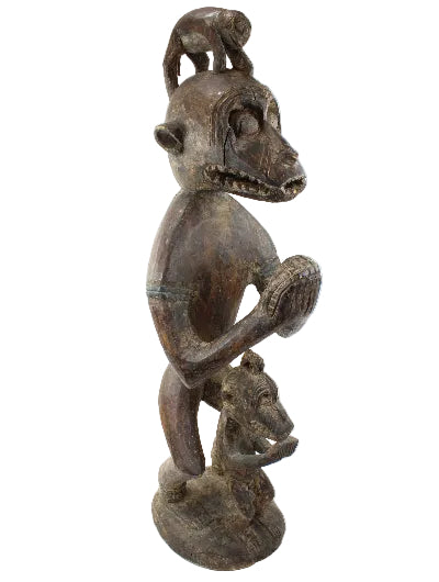 This 44" tall free-standing solid wood sculpture features a primitive adult with a monkey on its head, with a child.