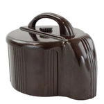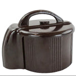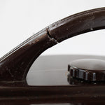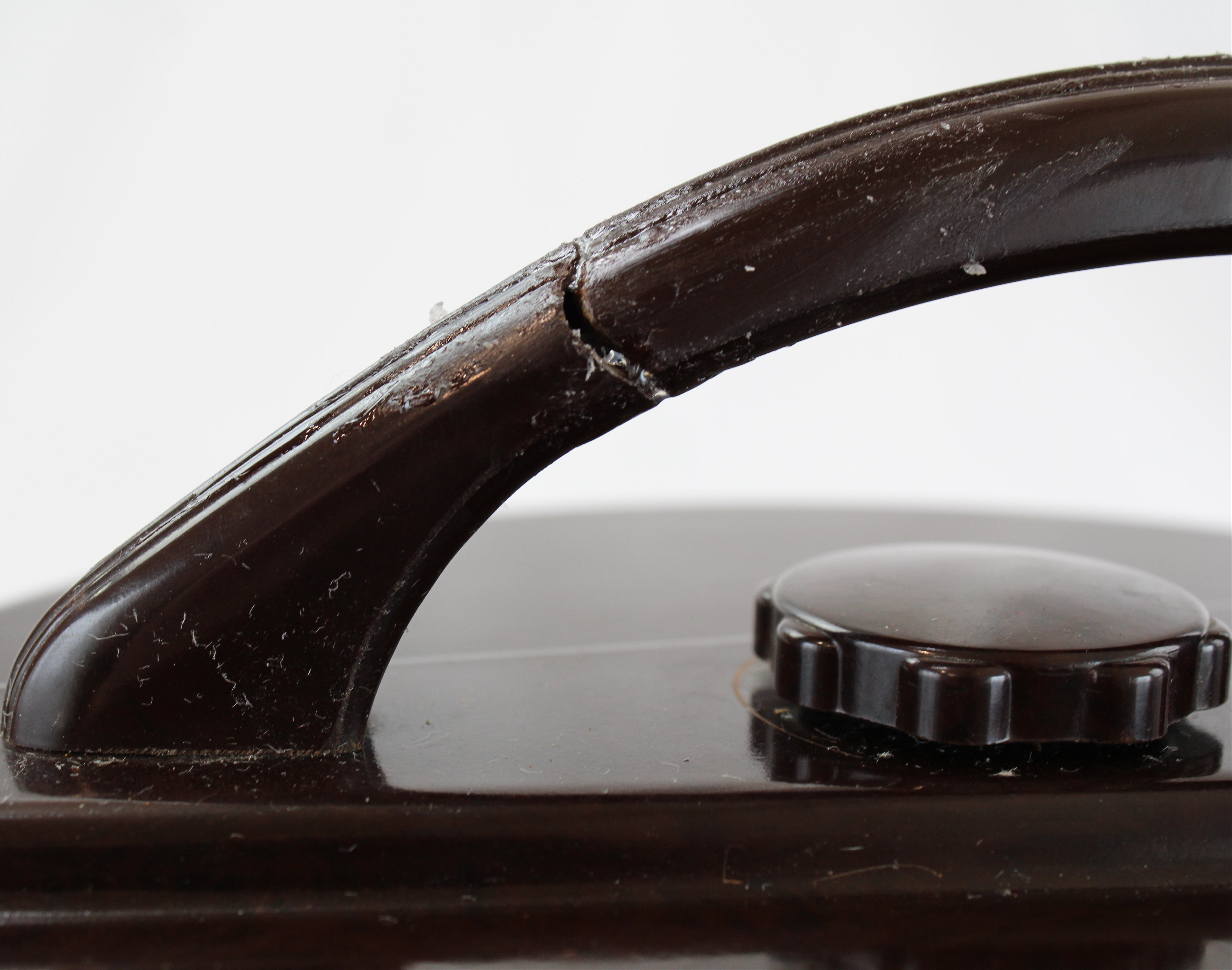 This 8-1/4" diameter and 5-3/4" tall art deco poker chip holder, dispenser and counter is in excellent condition except for a crack in the carrying handle that has been repaired with adhesive.