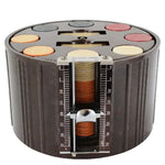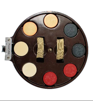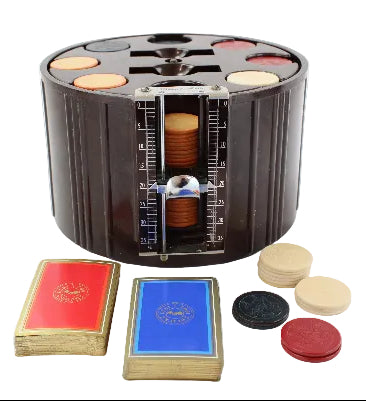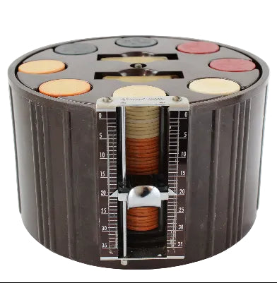 The unique carousel comes with eight stacks of the original Bakelite chips (35 chips per stack). The count-rite metal sliding chip counter is accessible for use for each stack of chips by turning the carousel.