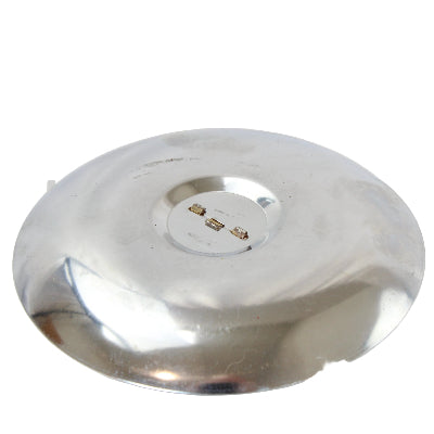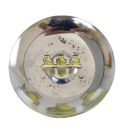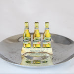 The 5" diameter ash tray has a chrome base that holds a die cut image of two Senate beer bottles and one ale bottle. Lit cigarettes would rest between the bottles.