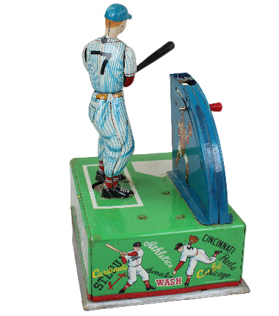 When working, the balls in the batting machine are raised one at a time to enable the batter to swing and hit the ball. The ball machine looks good from an operational perspective. The 7-1/2" tall toy's tin and colors remain very good with little scratching and only some minor oxidation near the metal seams.