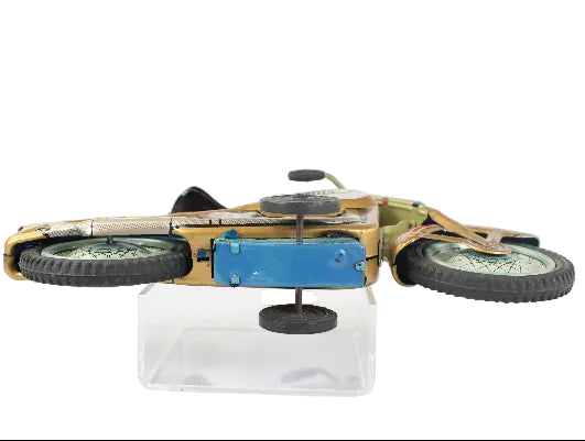 There are a few minor scratches on the gold painted Harley with the tires, wheels and engine cylinders with colored balls displaying well. The friction drive worked well when tested and two of the three engine cylinder balls did move up and down.