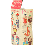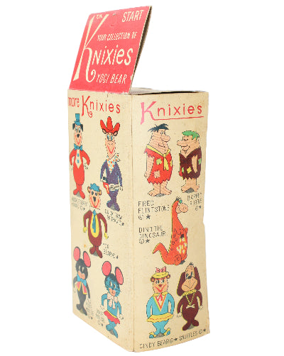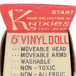 The box features the 15 Hanna-Barbera cartoon characters that are part of the Knixie collection series. The doll was manufactured by Knickerbocker Toy Company, and under the bottom feet, the 1962 Hanna-Barbera mark is present.
