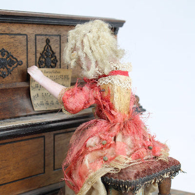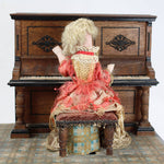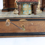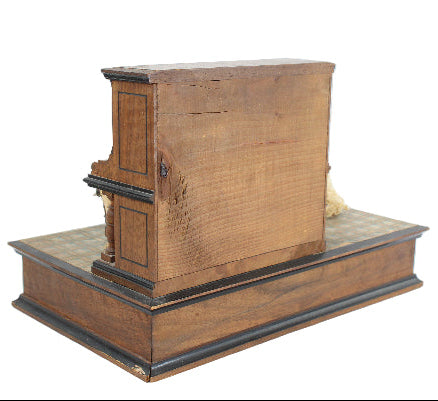 This Automator measures 13" in length, 7-1/2" in width, and the height to the top of the piano is 8-1/2". The floor of the stage is covered with a check pattern made of a material similar to antique wallpaper, and there is some minor paper loss on a small portion of the back edge of the floor paper; with some soiling and fading are evident on the floor.