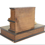 This one-of-a-kind wooden music box is likely over 150 years old and was probably made in France. The box features a wooden piano accompanied by a lady piano player. On the side of the piano is a male and a female dancing the waltz.