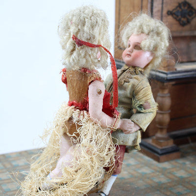 The three hand-painted bisque-like heads are in very good condition, as are the figures' arms, bodies, and legs. The blond wigs adorning each figure scream France.