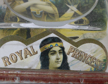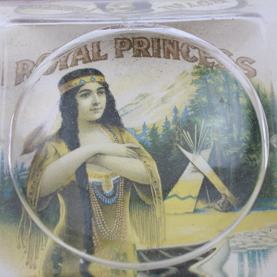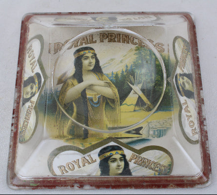 This retail counter glass change tray features the "Royal Princess" picture of the Native American woman in traditional Indian dress standing by a canoe and teepee.