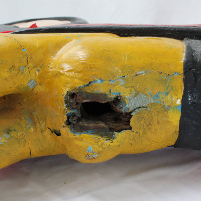 When found, this figure was mounted on a wall with a threaded pipe using the hole that would have mounted the figure to the carousel. Throughout the year, the structure of the neck supporting the head cracked and was repaired with industrial adhesive. A scarf was added around the neck of the figure to hide the repair.