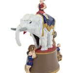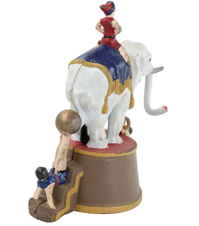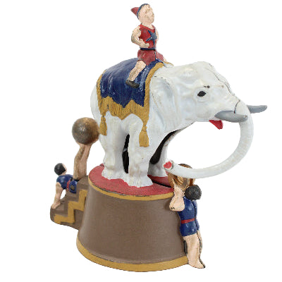 The bank measures 6" in height. Place a coin between the rings in front of the elephant, move the ball on the feet of the clown mounted on the back of the platform base, and the elephant's trunk will cause the coin to fall into the bank as the elephant riding clown turns sideways.