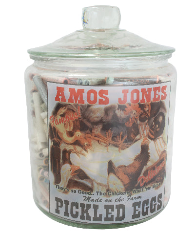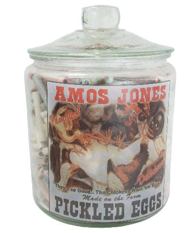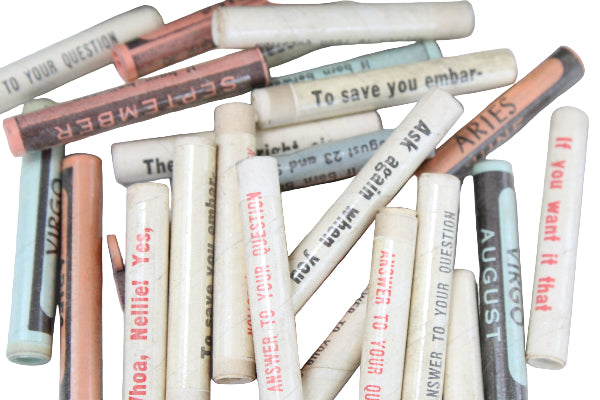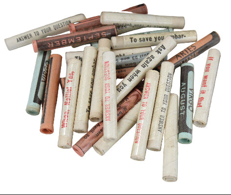 The large number (too many to count) of never-opened fortune teller scrolls have been stored for years in a jar labeled Amos Jones Pickled Eggs.