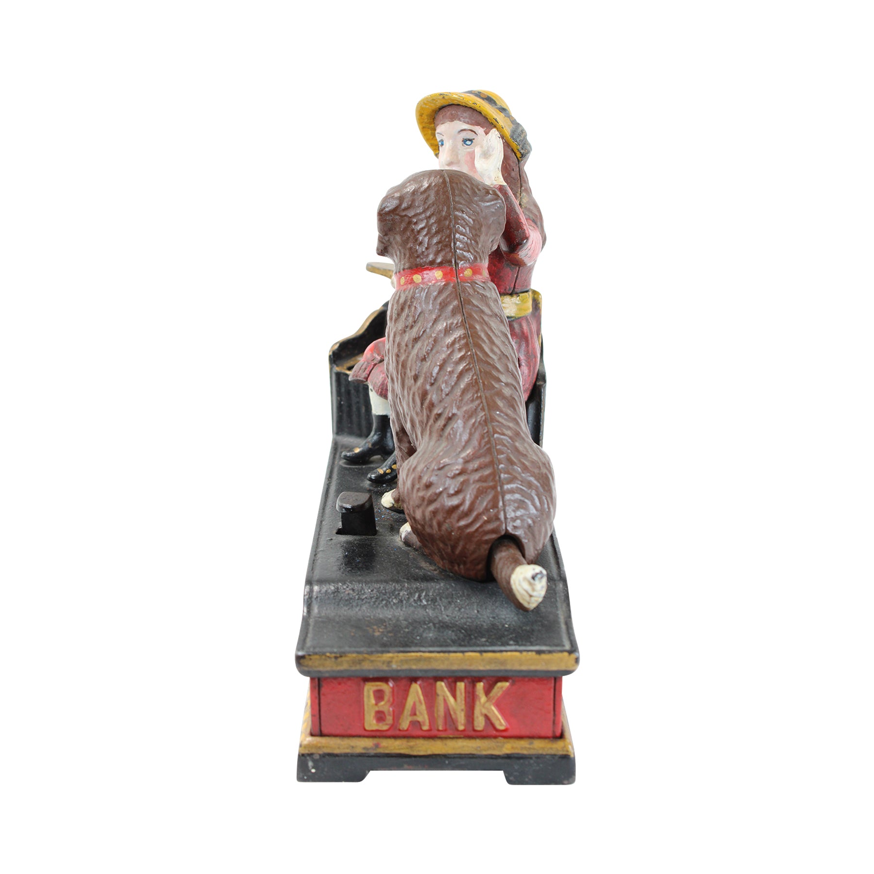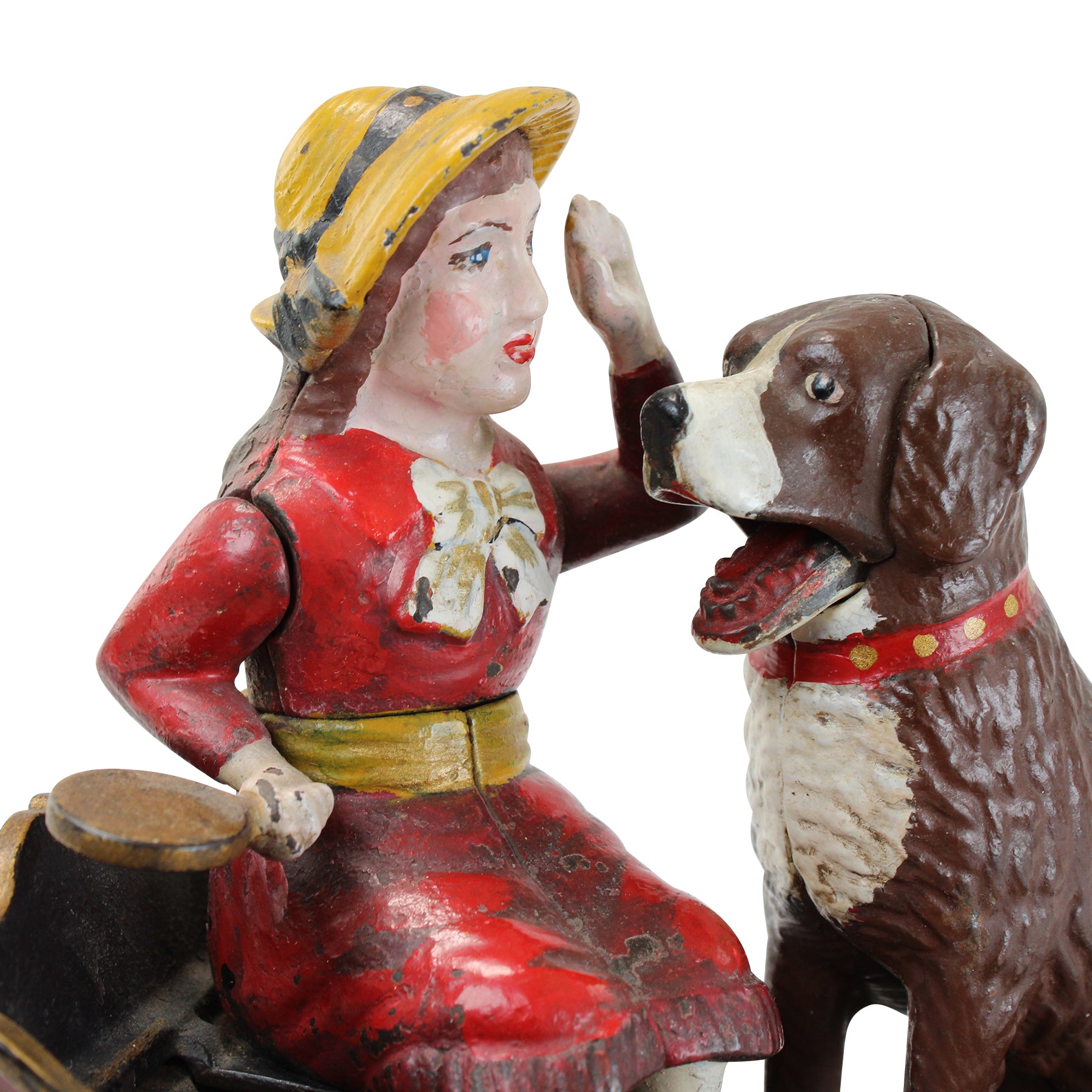 Place a coin on the sitting girl's paddle, push the lever near the dog, and the girl deposits the coin in the drop as the dog opens its mouth and wags its tail.