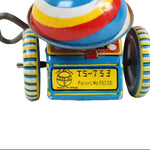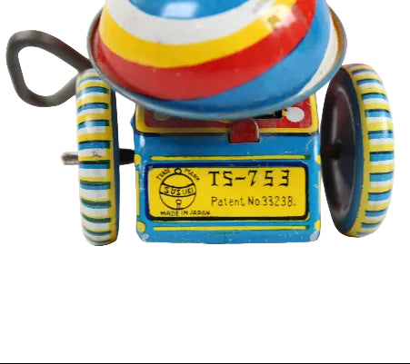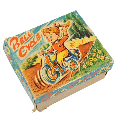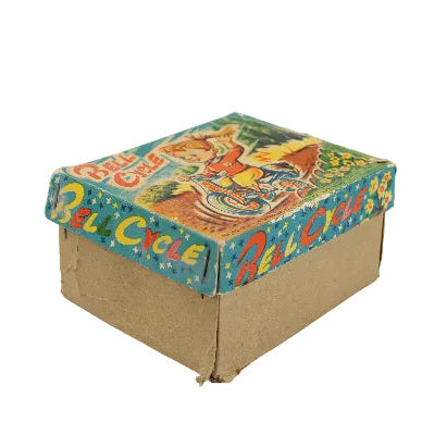The condition of the toy is excellent. The wind-up mechanism functioned well when tested, and the bell-ringing spinner that propels the wheels operated perfectly. The original box is in very good condition with only one corner staple missing.