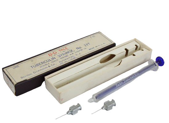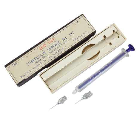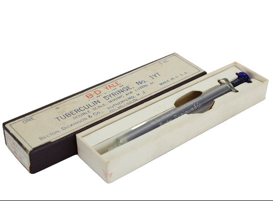 The importance of the invention of the tuberculosis vaccine in 1921 should not be forgotten. The glass syringe, needle and box remain in very good condition with a blue plunger ready to eradicate TB.