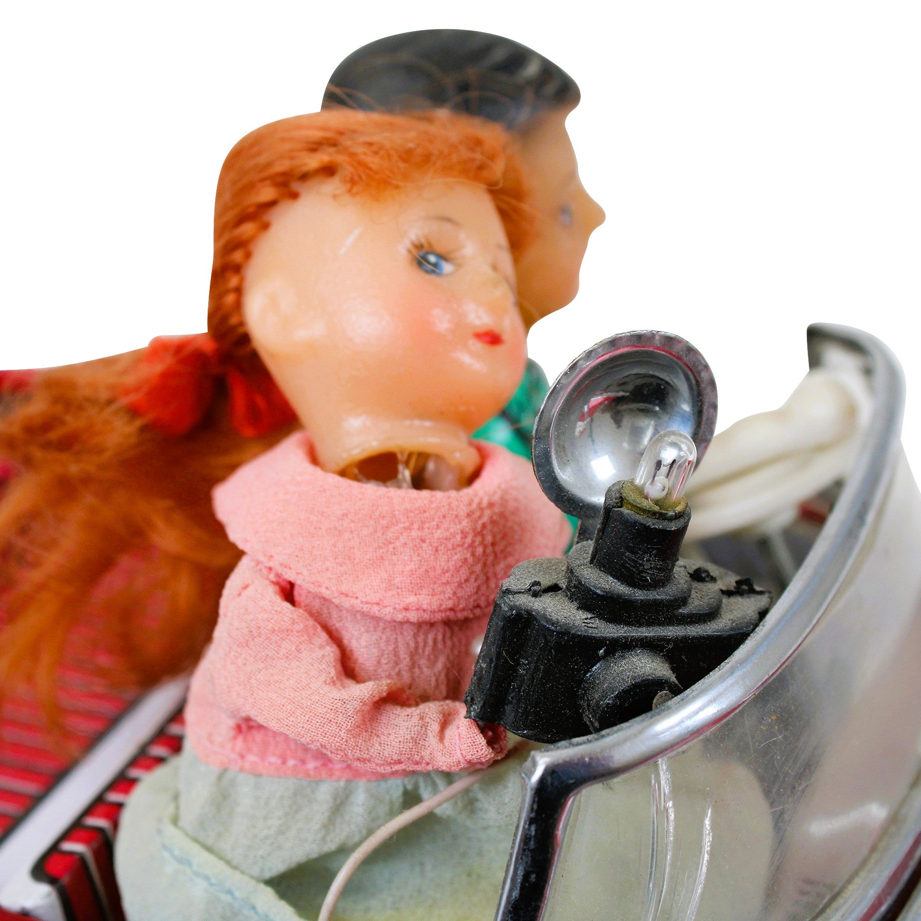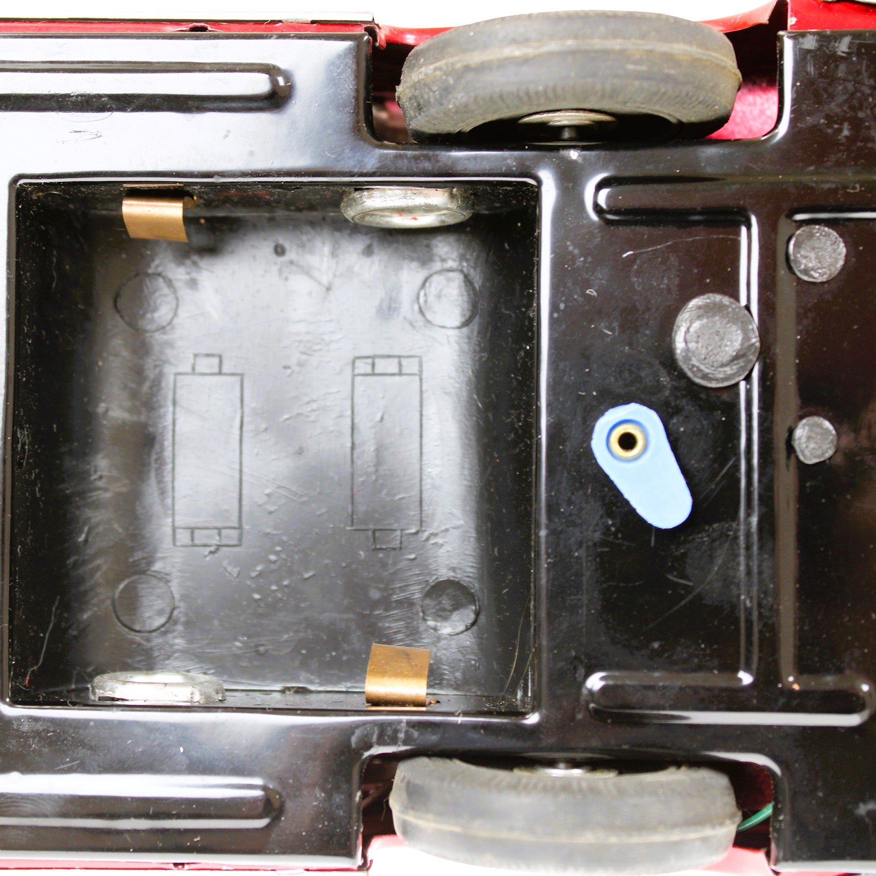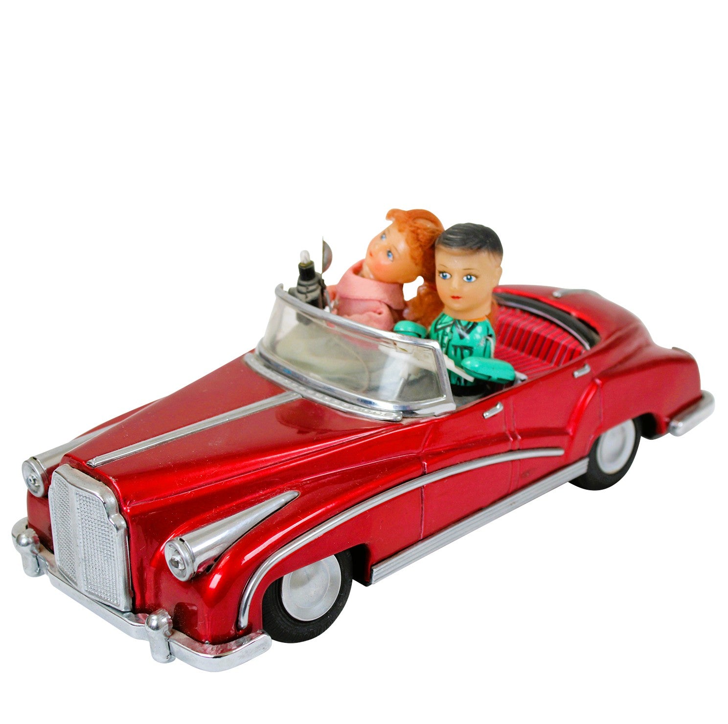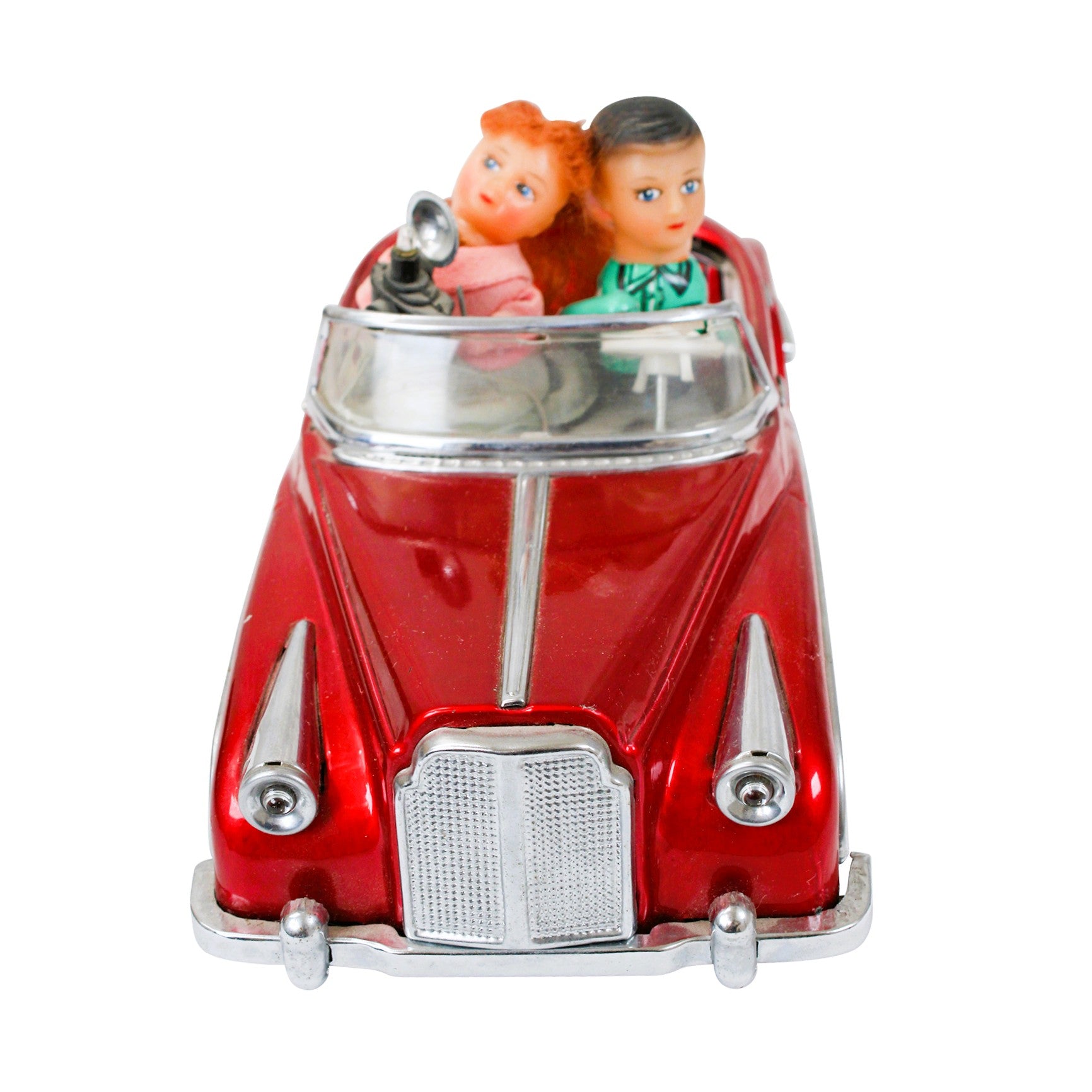 This attractive 12" red ruby colored car with driver and photographer female passenger has it all except for the ability to turn on. The workings of older Chinese toys are often known for quality control issues.