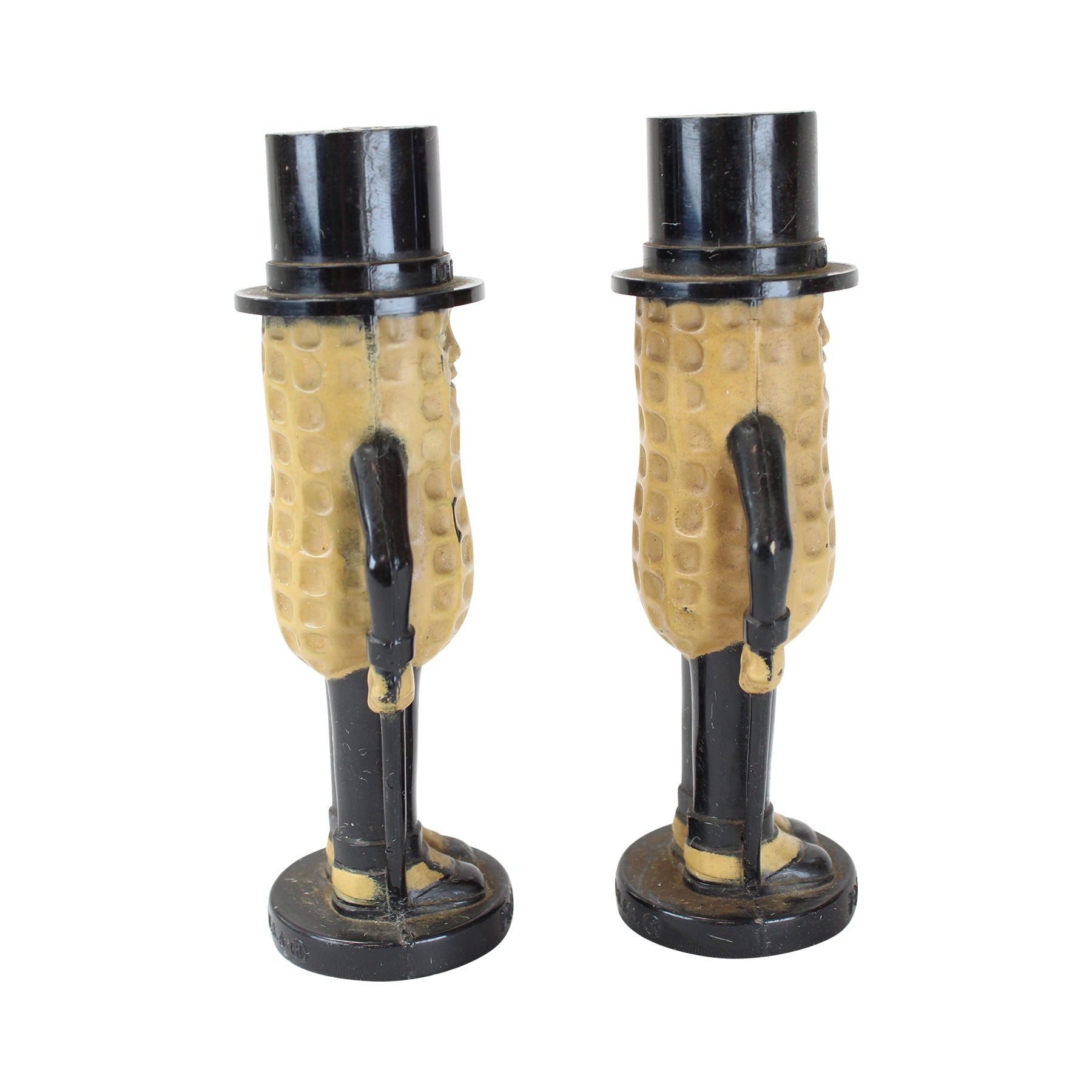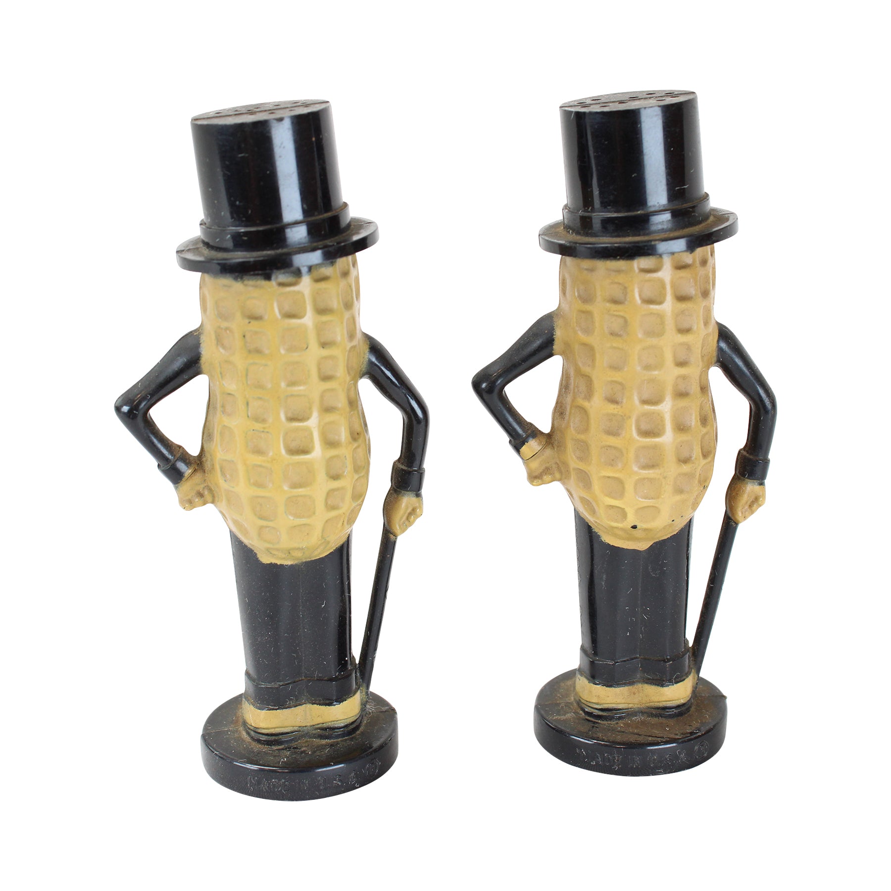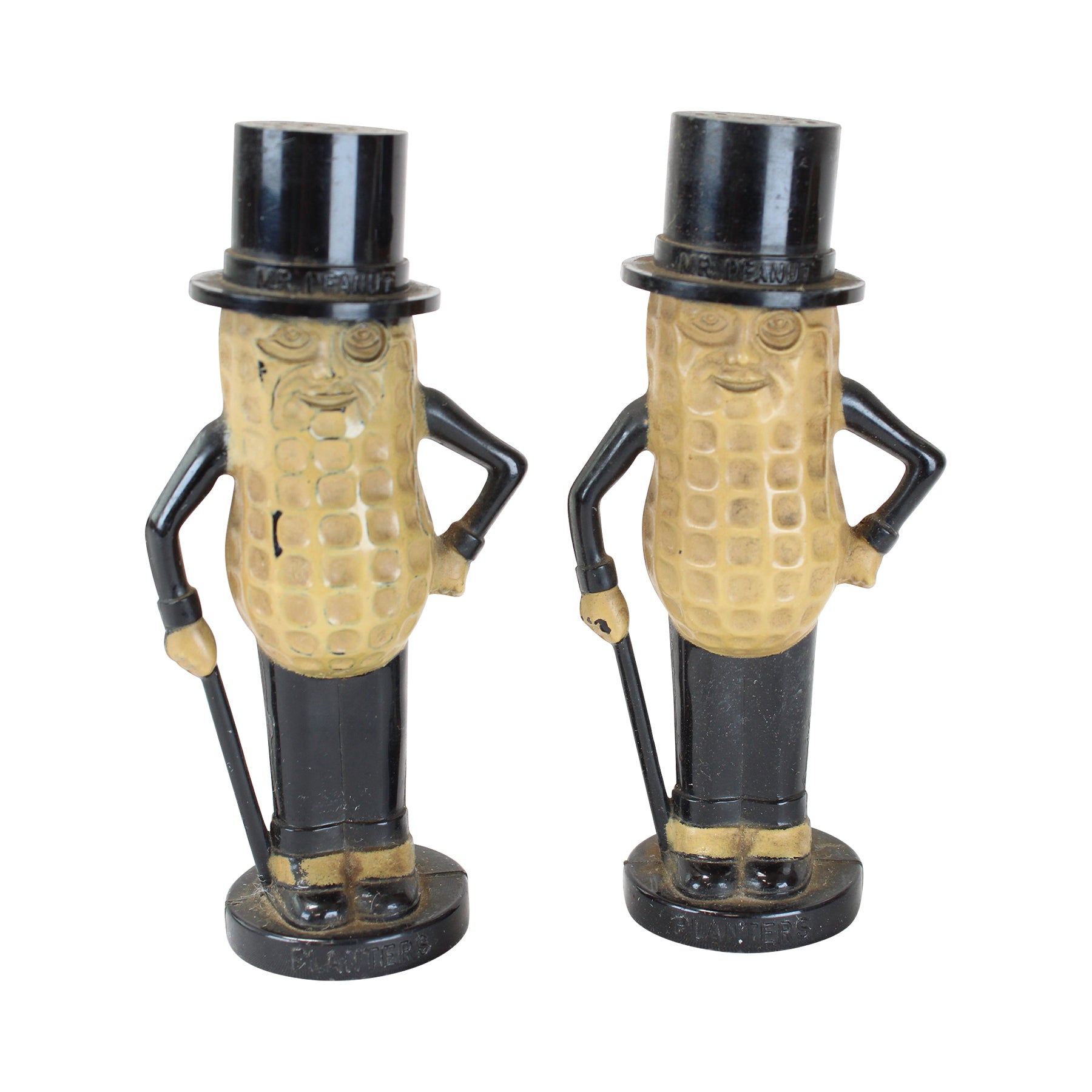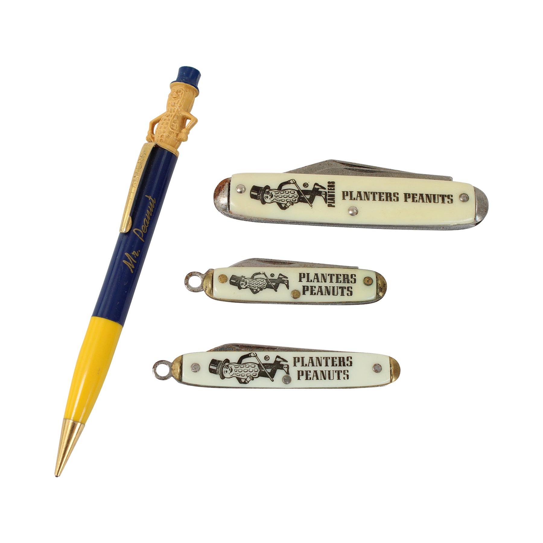 In addition to the peanut-themed bowls, there is a set of 4 Mr. Peanut plastic salt & pepper shakers with stoppers, 3 folding very good condition Mr. Peanut pocket knives, including a 3-1/2" long dual blade, 3" single blade & a 2-1/4" single blade and a Mr. Peanut mechanical lead pencil to complete this popular themed lot.