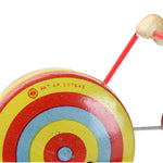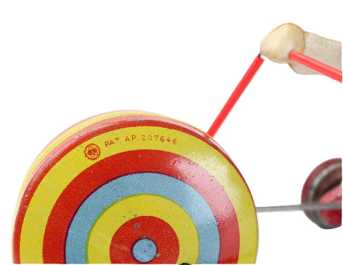 The key winds the spring mechanism located in the colorful front wheel of the trike. The winding mechanism worked well when tested, as the trike quickly moved forward with the riding pig hanging on as intended.