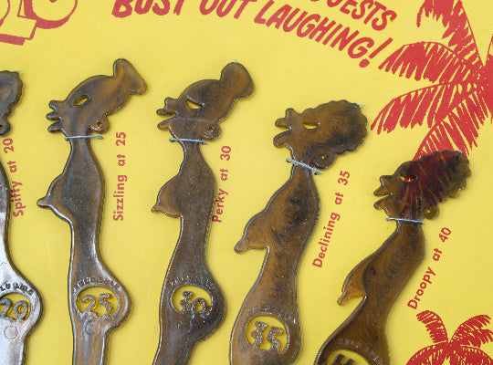 The six swizzle sticks is a chronology of the imaginary changes to the shape of women from the age of 15 to over 40.