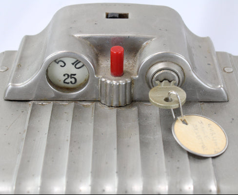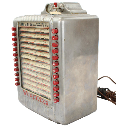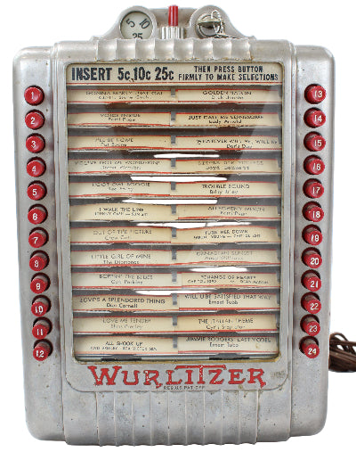 This very good condition attention-getting Wallbox would accept nickels, dimes and quarters (5¢ per song) from customers who could select up to 24 songs to play.